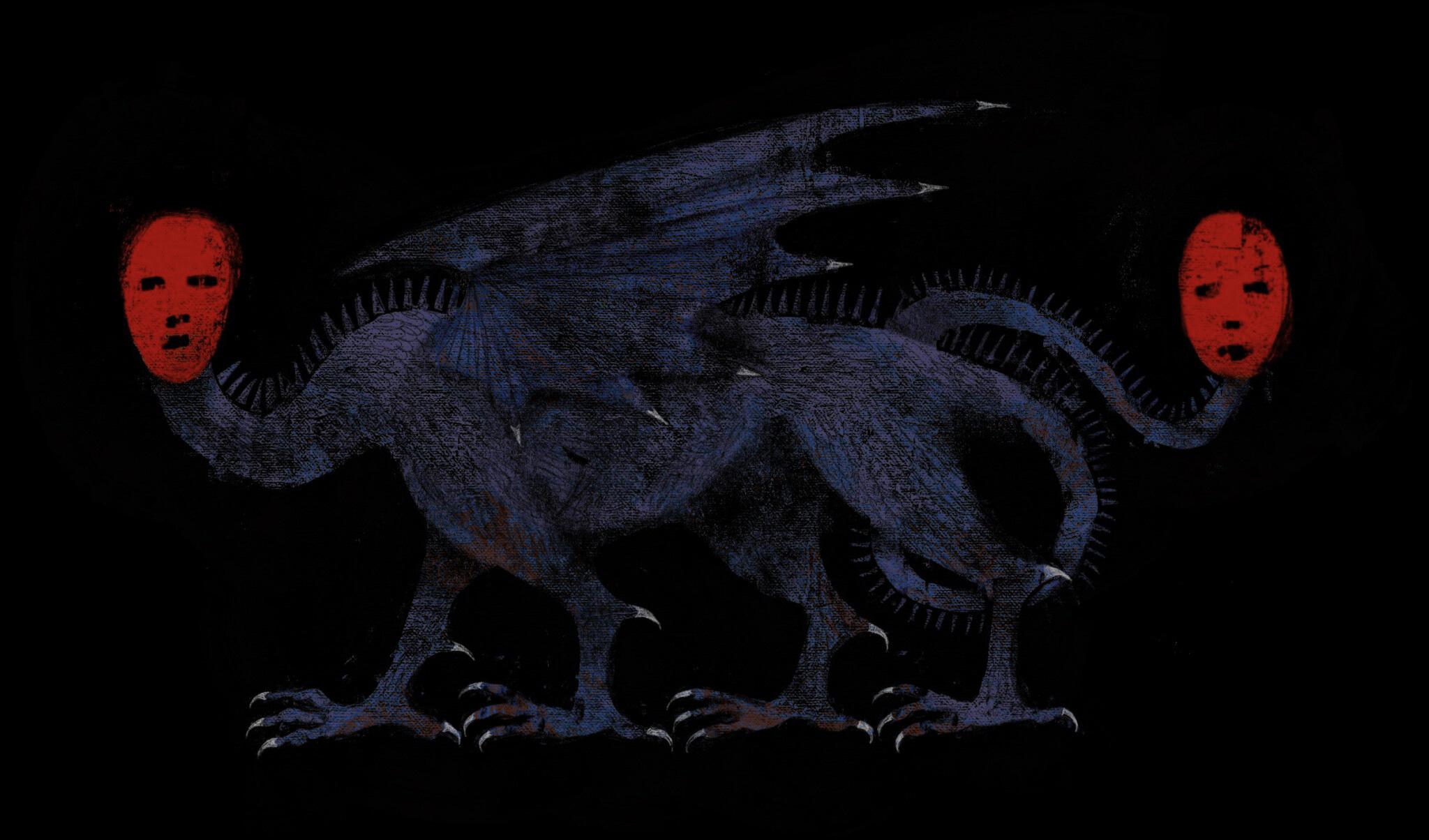 Dans mon tableau — orné d’or et d’argent — il y a un dragon qui hurle sa fureur. Son sang est un rubis, une pierre brute que mes mains émoussées ne parviennent pas à griffer. La voix du sang m’appelle à lui, sa force est ma faiblesse ; les liens du sang m’empêchent de le détruire, il est le vray sang qui ne peut mentir*. Visage de ma défaite, écaille de nuit — visage de ma colère, sang rubis.